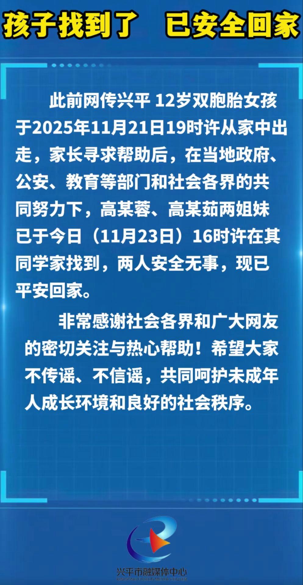 23日下昼4时许传来好音信,两个孩子在她们的同学家被找到,情景很好。高先生也通过华商报大风新闻感谢兴平公安,感谢社会各界的关心。